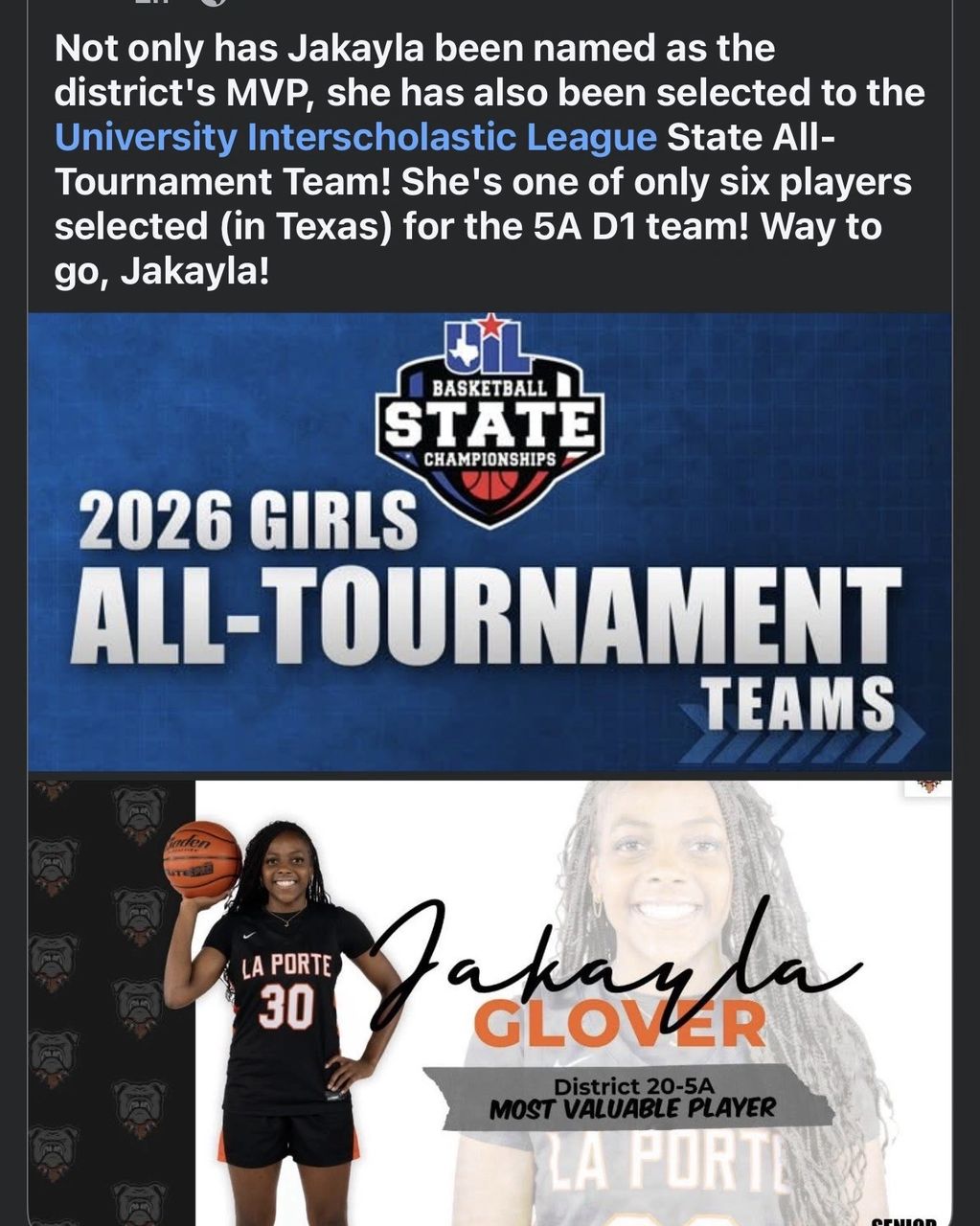 Another huge accomplishment for Jakayla Glover on being selected to the UIL State All-Tournament Team! Being recognized as one of the top players in the state is a major achievement and a true reflection of your talent, work ethic, and determination. Keep making your mark — we are so proud of you!